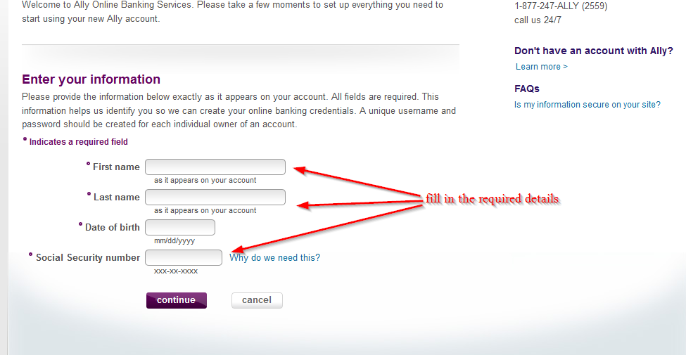 Step 2– Provide the information in the page as they appear on your bank account. Make sure that fill all the fields accurately. This information will help the bank to identify you so that they can create an online account for you. You will need to use a unique username and password for the account.